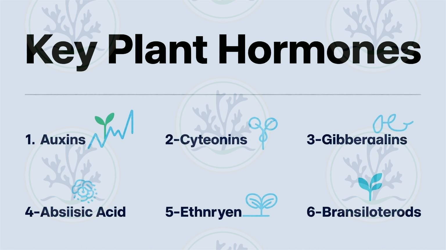 Key categories include: auxins, cytokinins, gibberellins, abscisic acid (ABA), ethylene, brassinosteroids, plus jasmonates and salicylic acid.