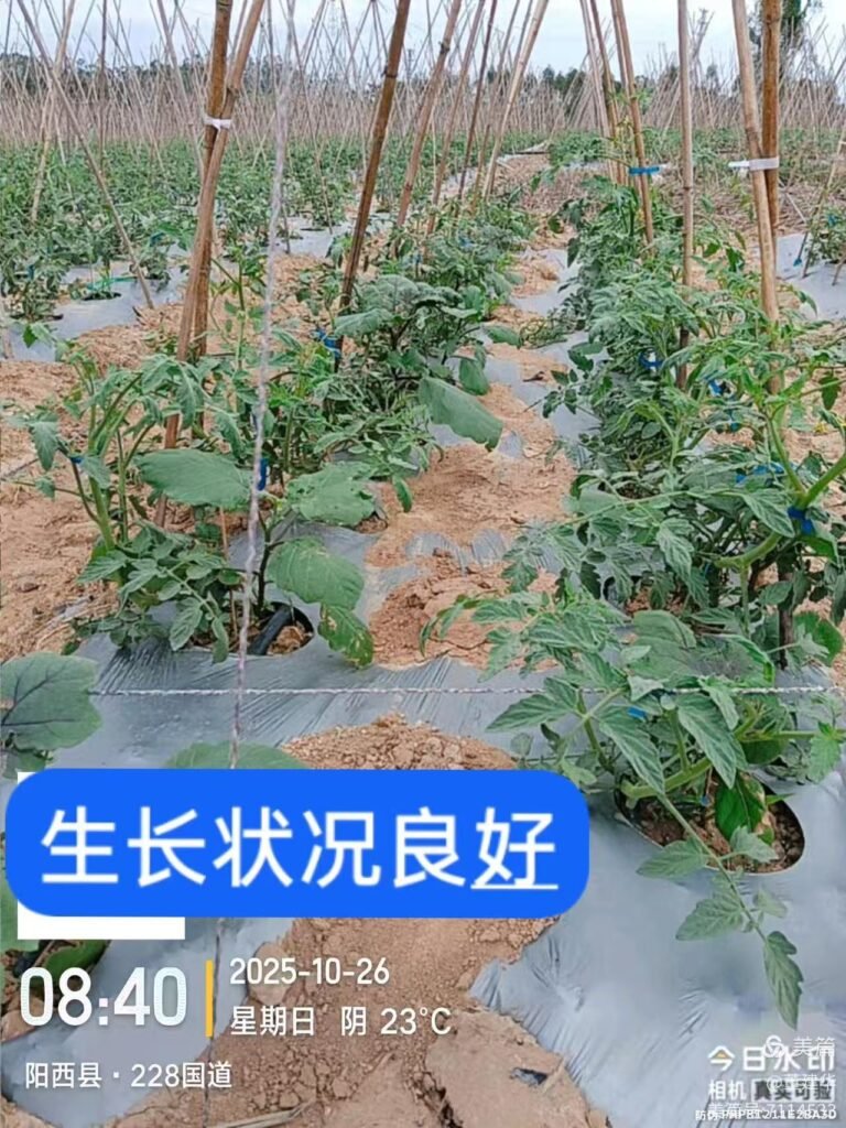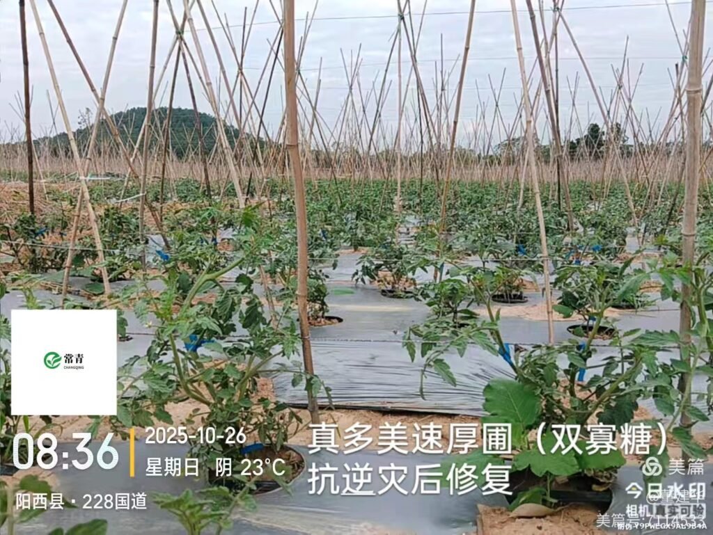 Short answer: Despite six consecutive years of tomato cultivation (which heightens risks like bacterial wilt and root rot), the field surpassed nearby bases—some with better soils and intensive management—in flower and fruit numbers. Plants showed thick, upright stems and dark green, active foliage. Soilhope also displayed disease-control advantages, inhibiting bacterial wilt, canker, and viral diseases, reducing post-disaster vulnerability. By the October 26 revisit, growth had rebounded beyond pre-disaster levels, positioning the field for a high-yield harvest.
